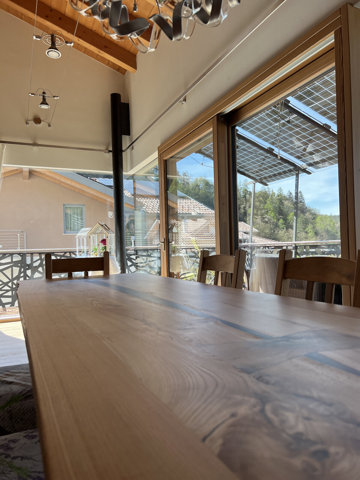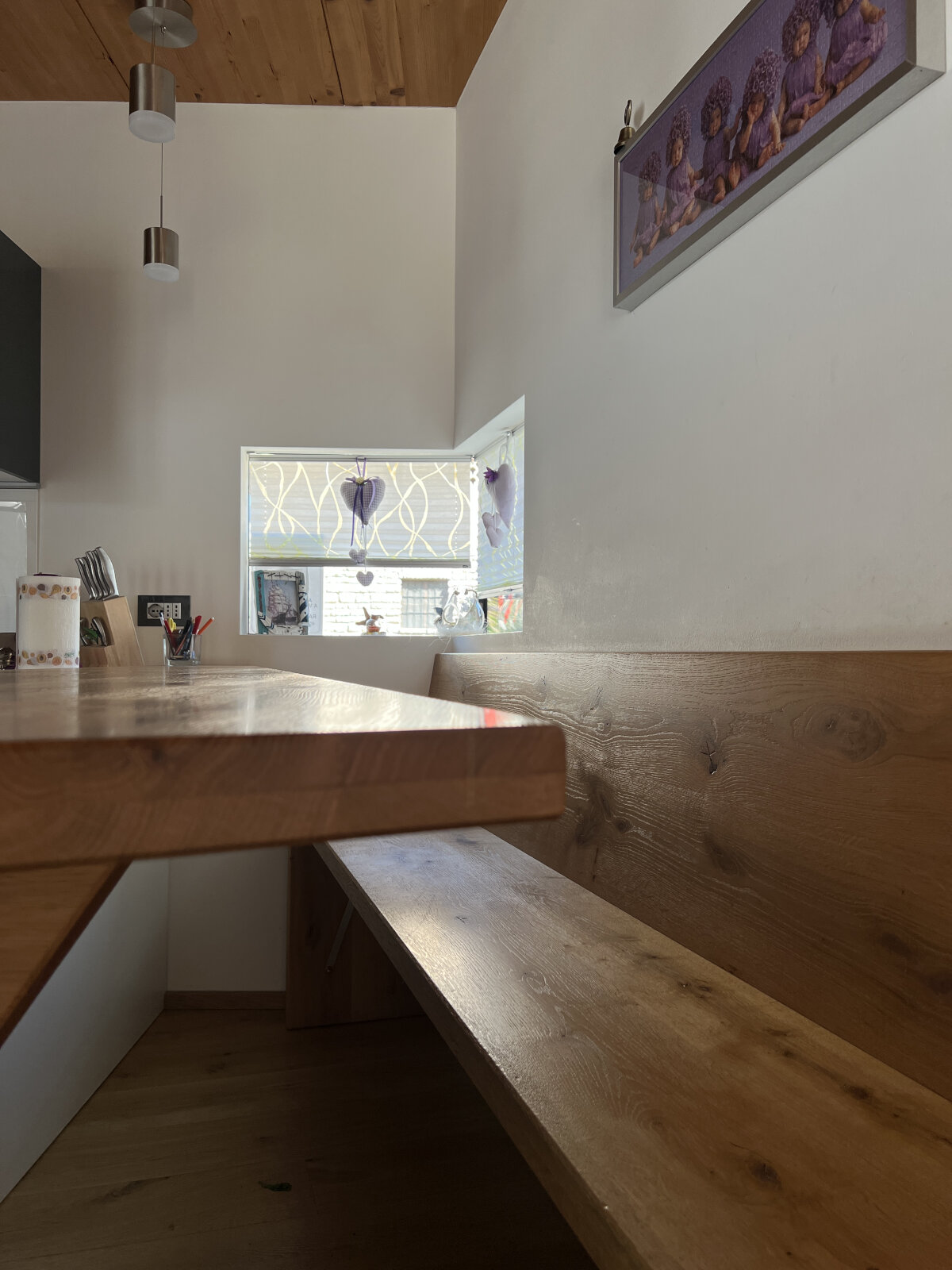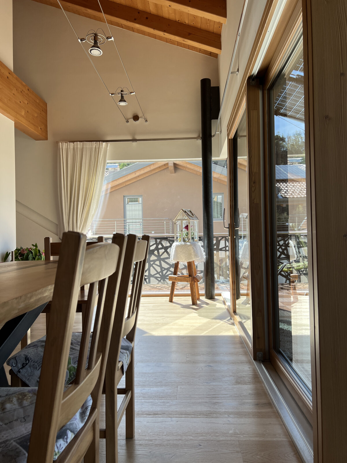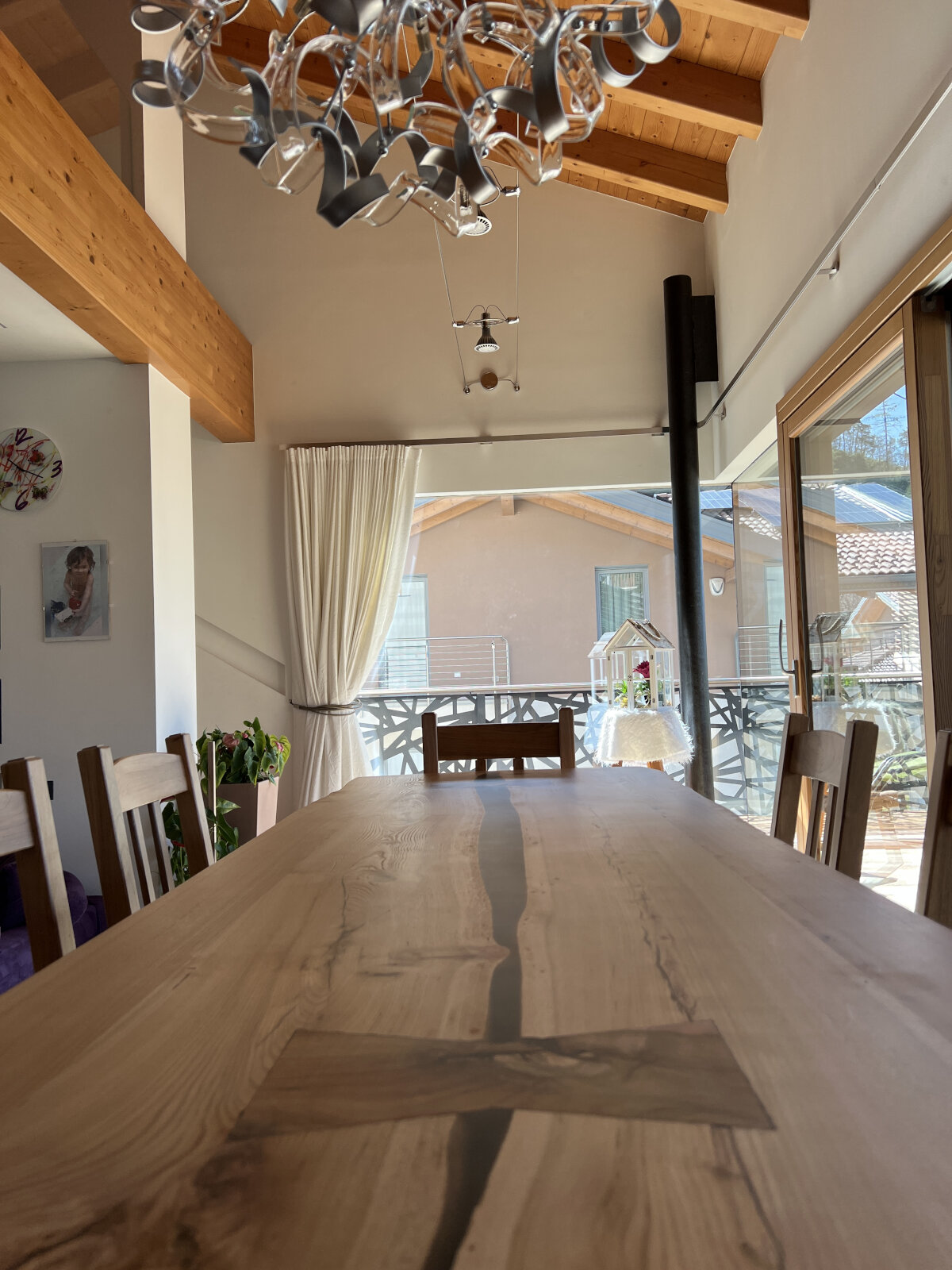 Arredo su misura per la zona giorno con mobili integrati, linee pulite e finiture calde che valorizzano l’ambiente. Le finestre in legno/alluminio garantiscono luminosità e continuità estetica, mentre gli elementi contenitivi e le proporzioni curate costruiscono uno spazio ordinato, accogliente e funzionale.