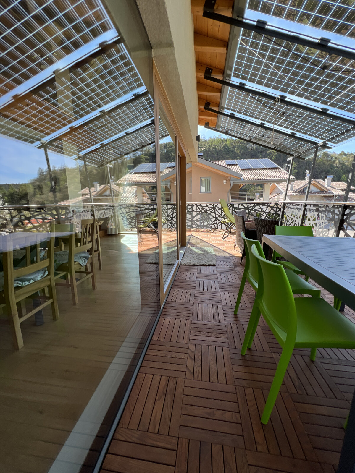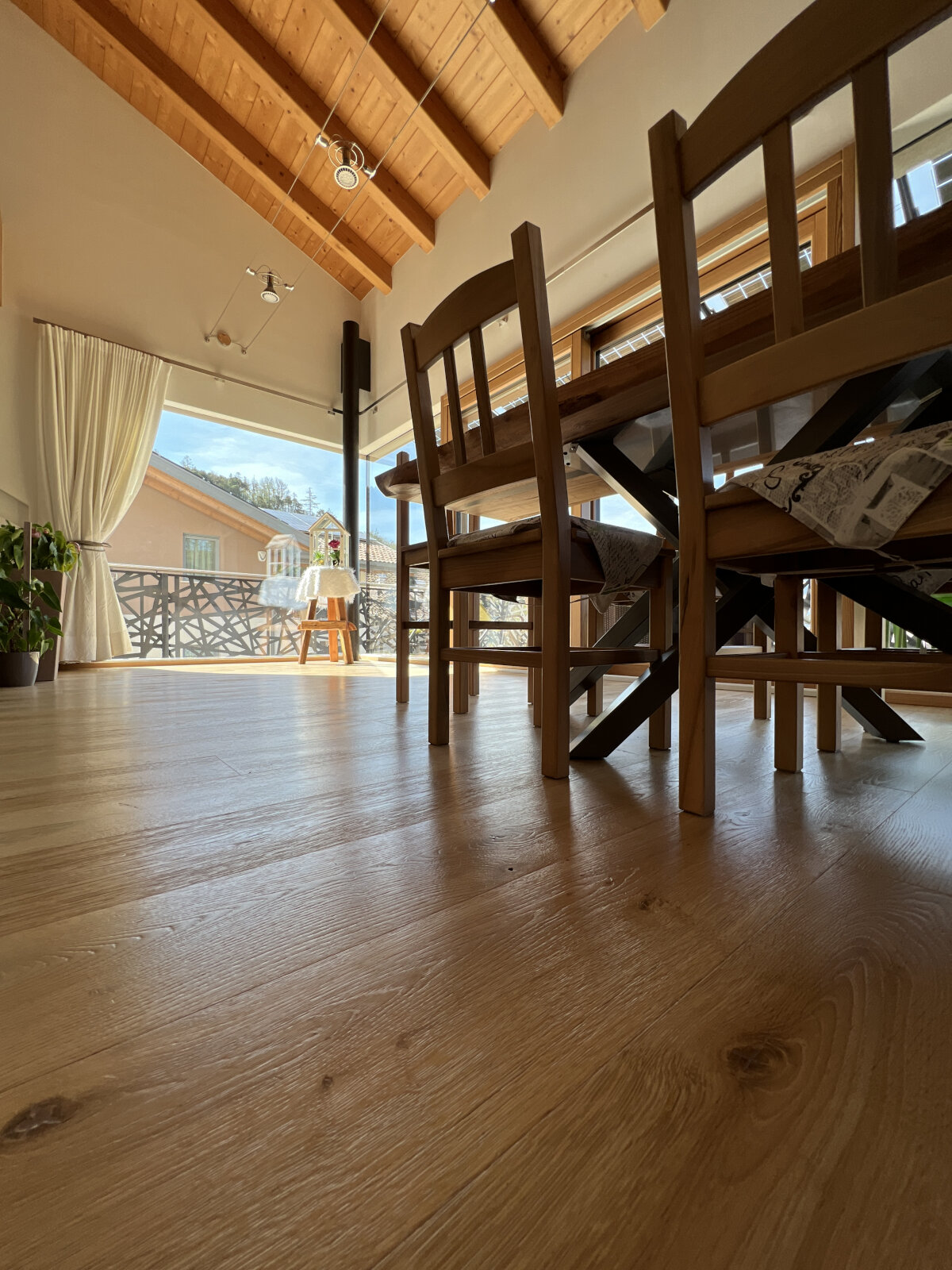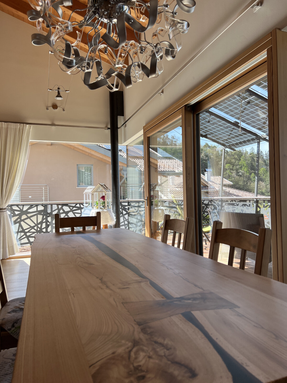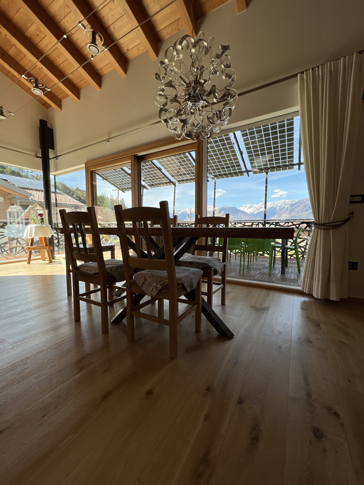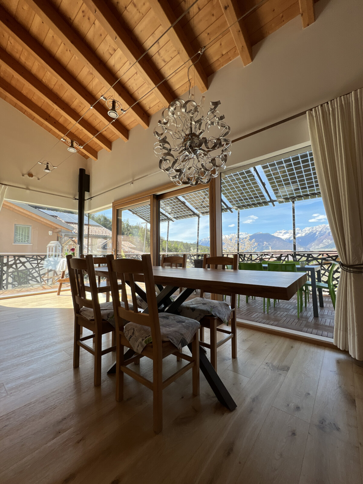 Arredo su misura per la zona giorno con mobili integrati, linee pulite e finiture calde che valorizzano l’ambiente. Le finestre in legno/alluminio garantiscono luminosità e continuità estetica, mentre gli elementi contenitivi e le proporzioni curate costruiscono uno spazio ordinato, accogliente e funzionale.
