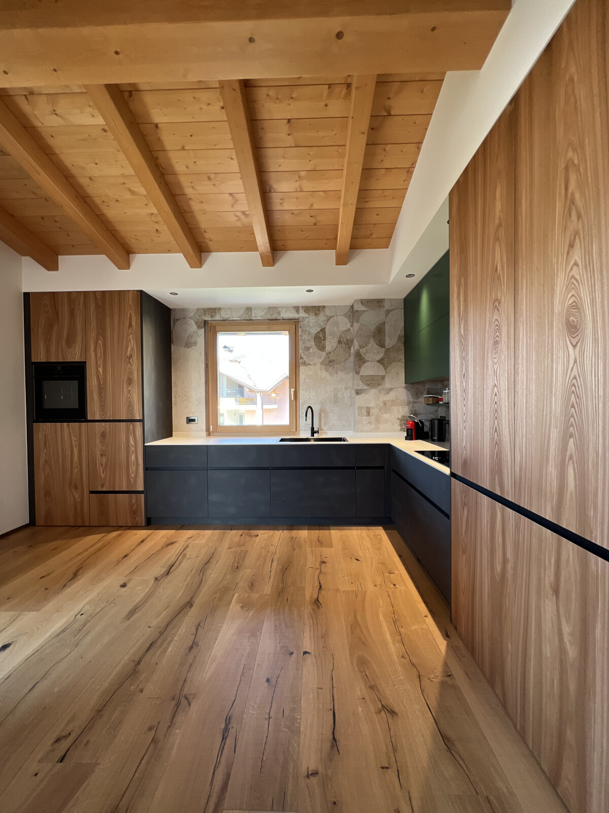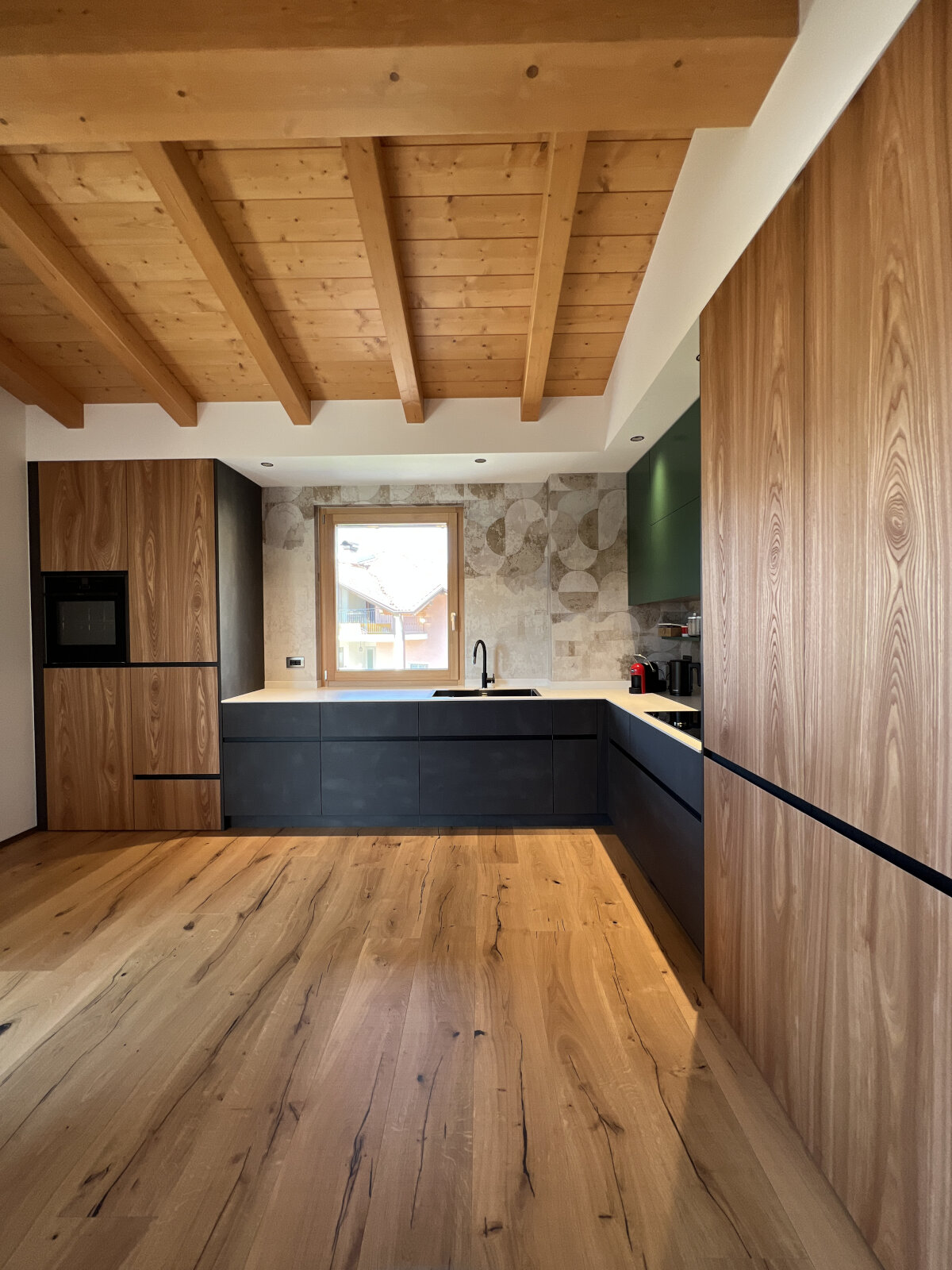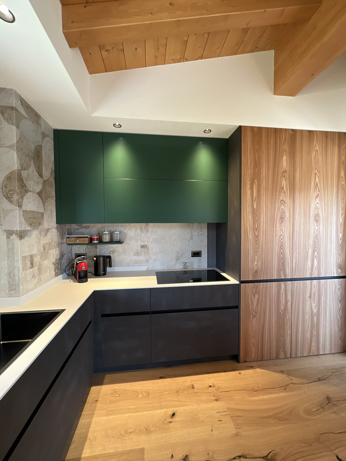 Arredo cucina, serramenti e porte interne realizzati su misura con un linguaggio uniforme e contemporaneo. La cucina integra piani puliti, colonne funzionali e finiture calde che dialogano con le finestre in legno/alluminio e le porte interne coordinate, creando un’estetica armonica in tutta l’abitazione. Un intervento completo che unisce design, praticità e qualità artigianale.