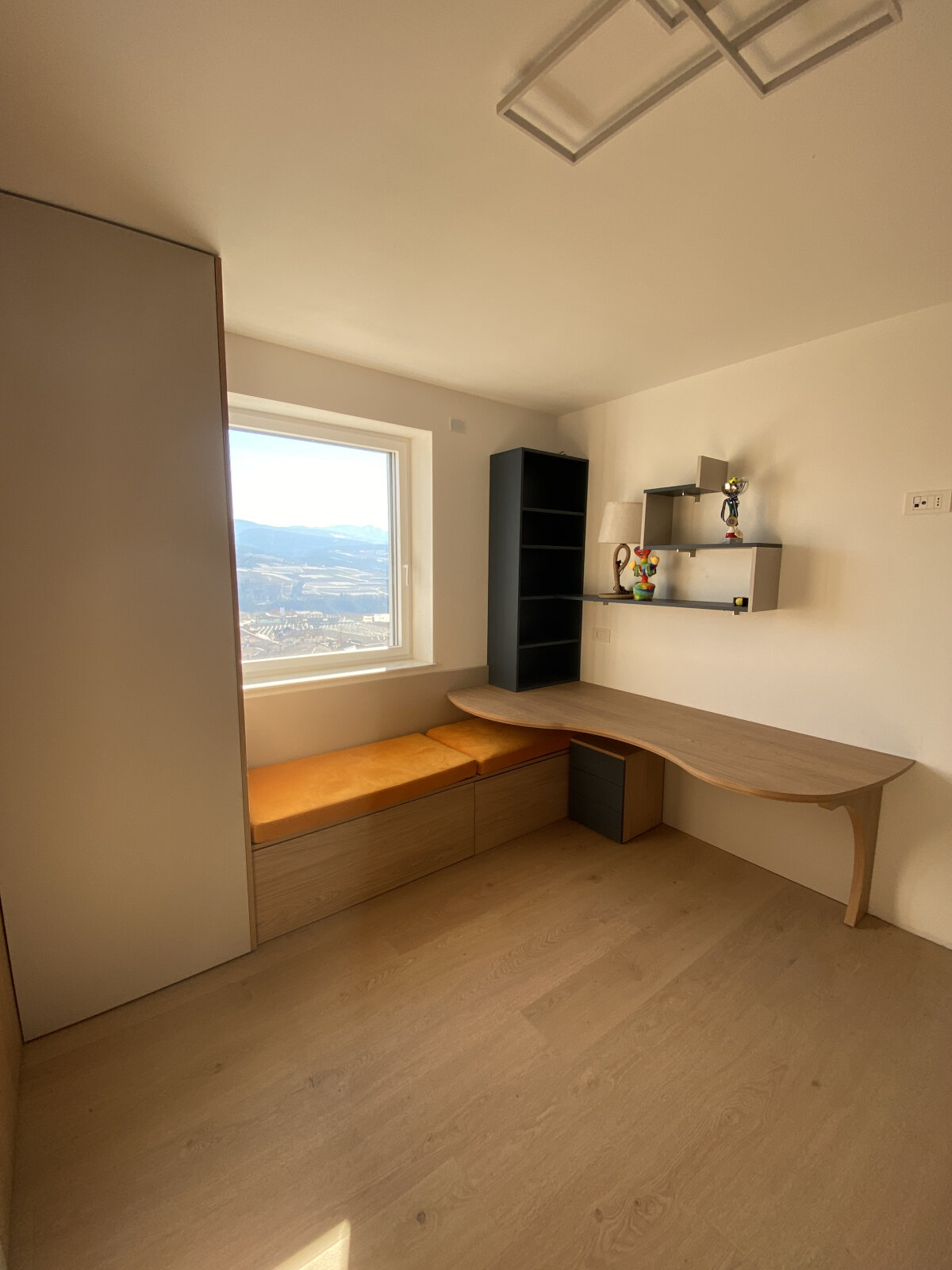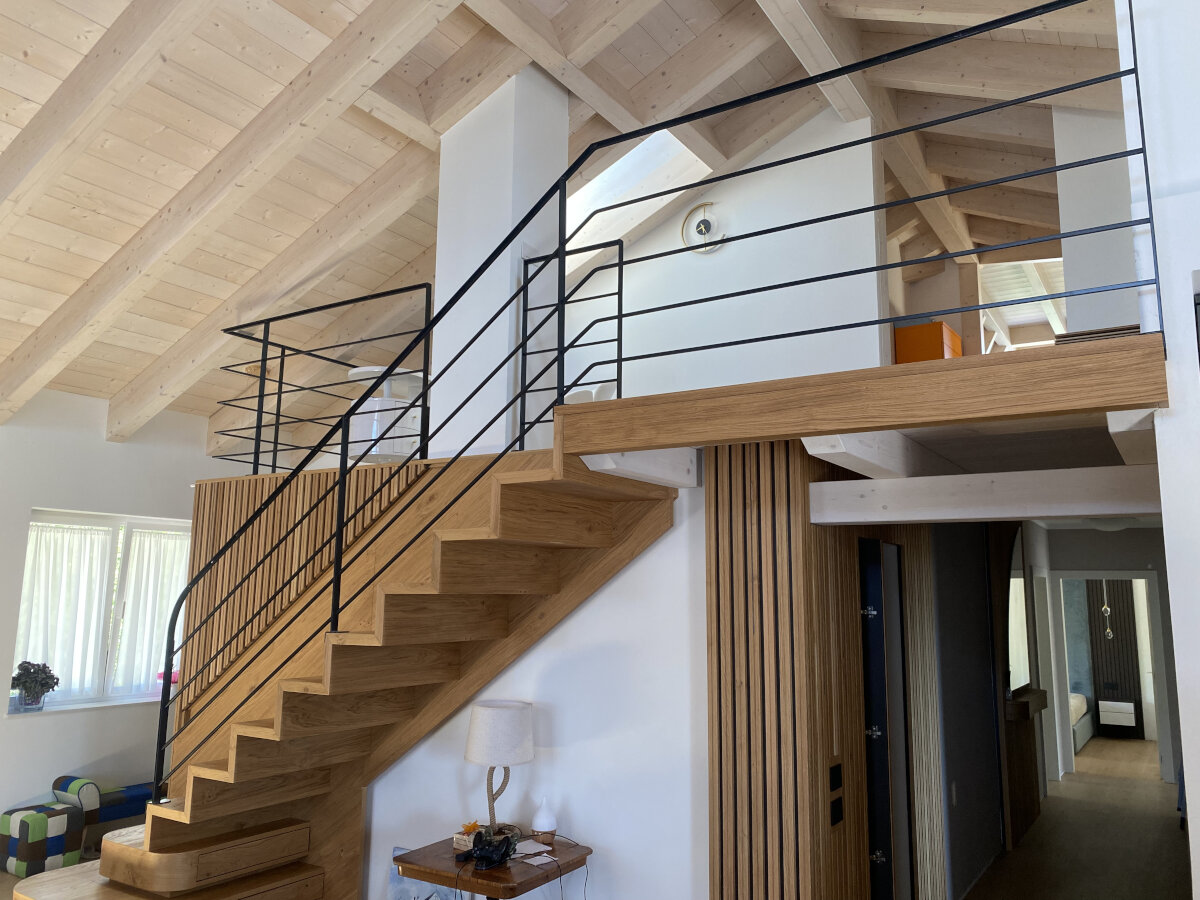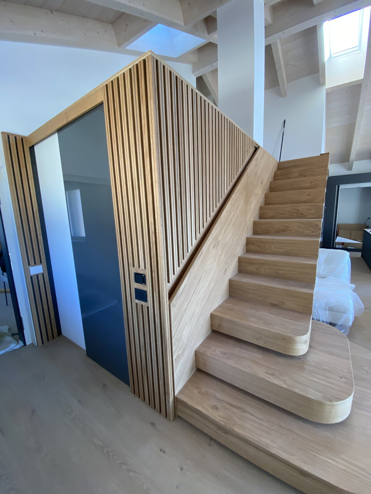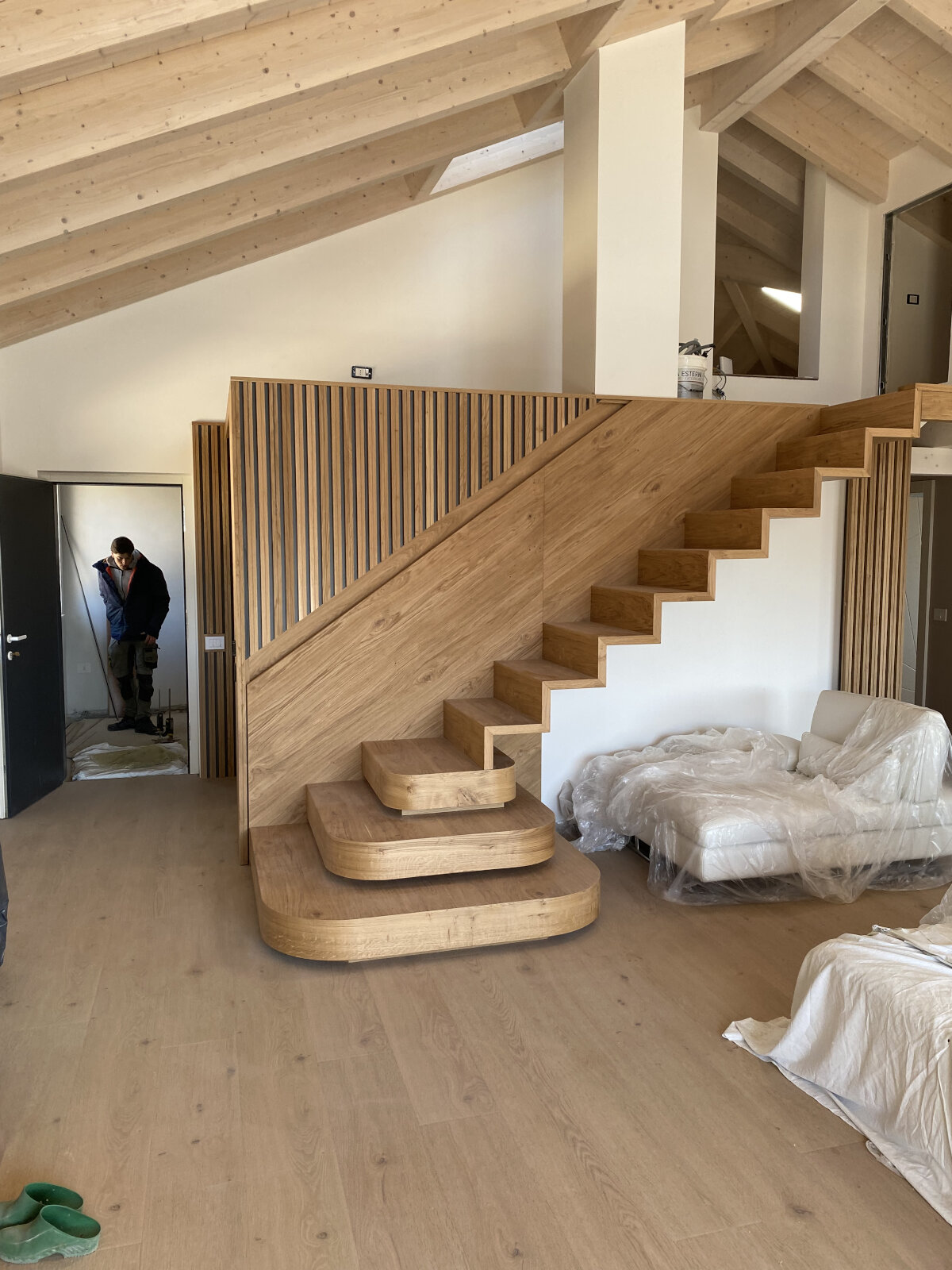 Arredo interno e scala su misura in legno, progettati per dare continuità materica agli ambienti dell’abitazione. La scala, dalle linee pulite e dalla struttura leggera, si integra con i mobili contenitivi e le finiture calde, creando uno spazio ordinato, elegante e ben organizzato.