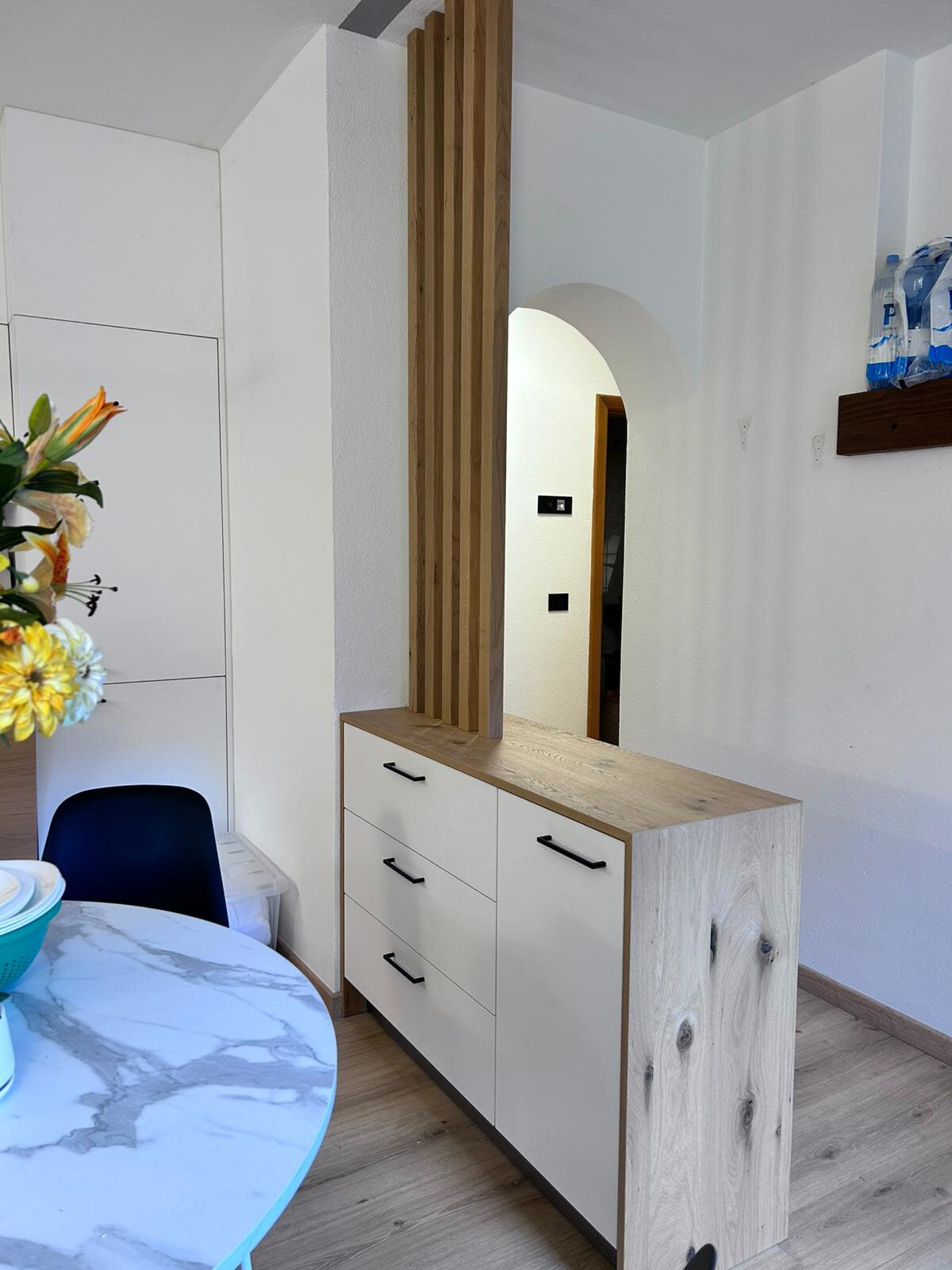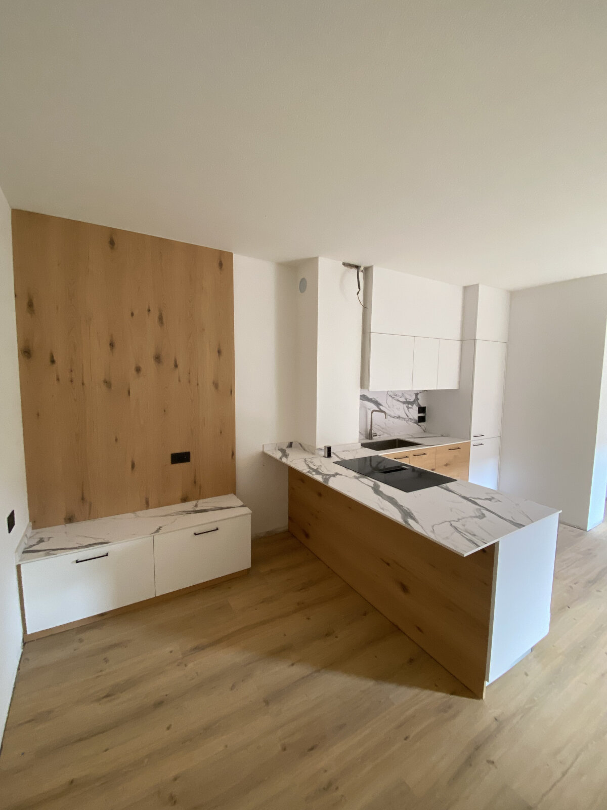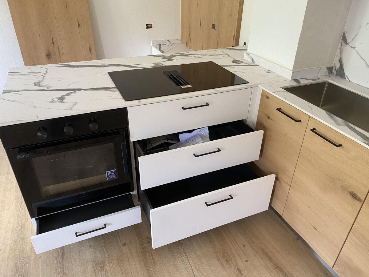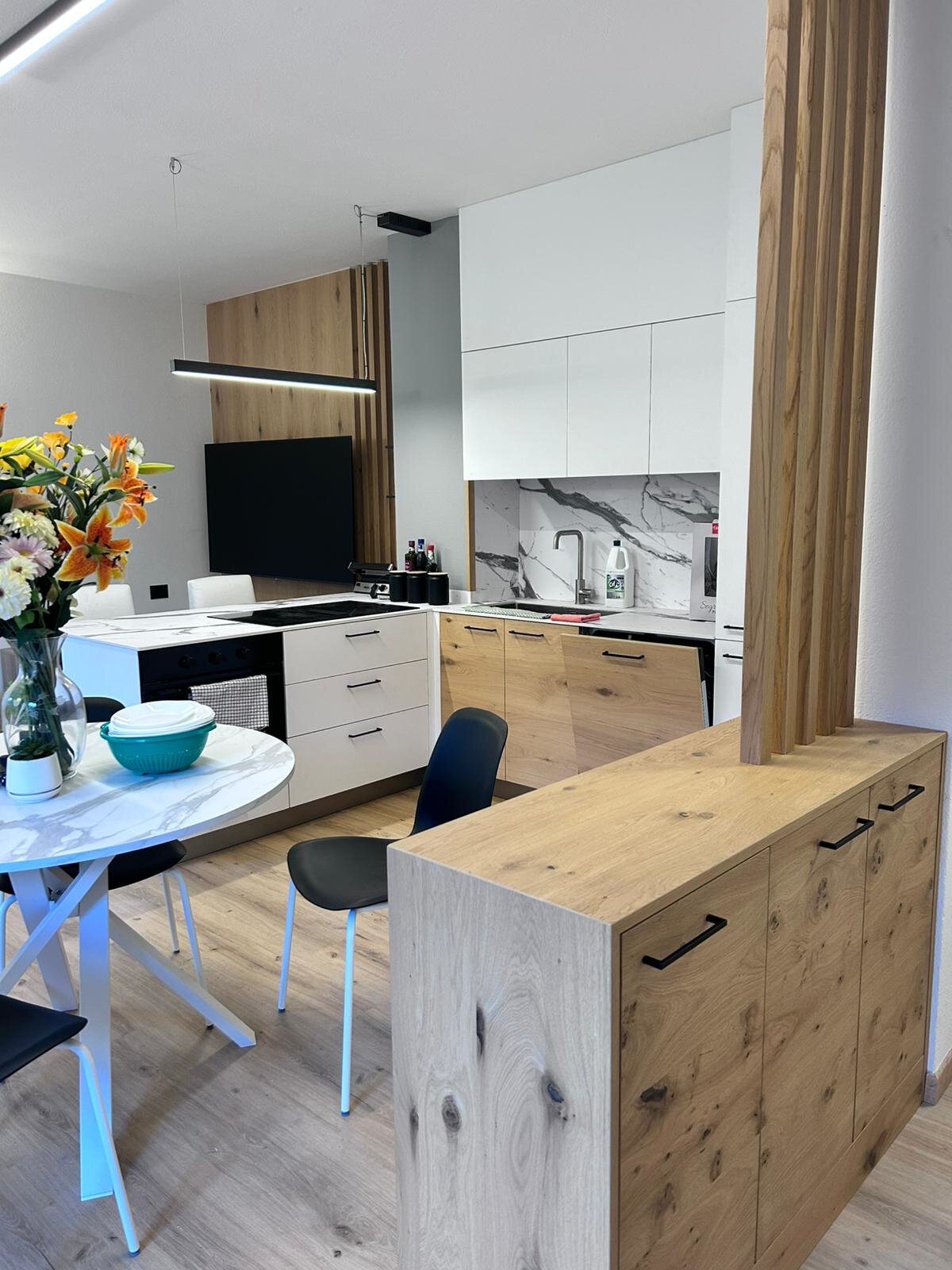 Cucina e arredi su misura con linee essenziali, colonne integrate e finiture calde che rendono l’ambiente ordinato e accogliente. I mobili su misura ottimizzano gli spazi e creano un’estetica continua, pulita e funzionale in tutta la zona giorno.