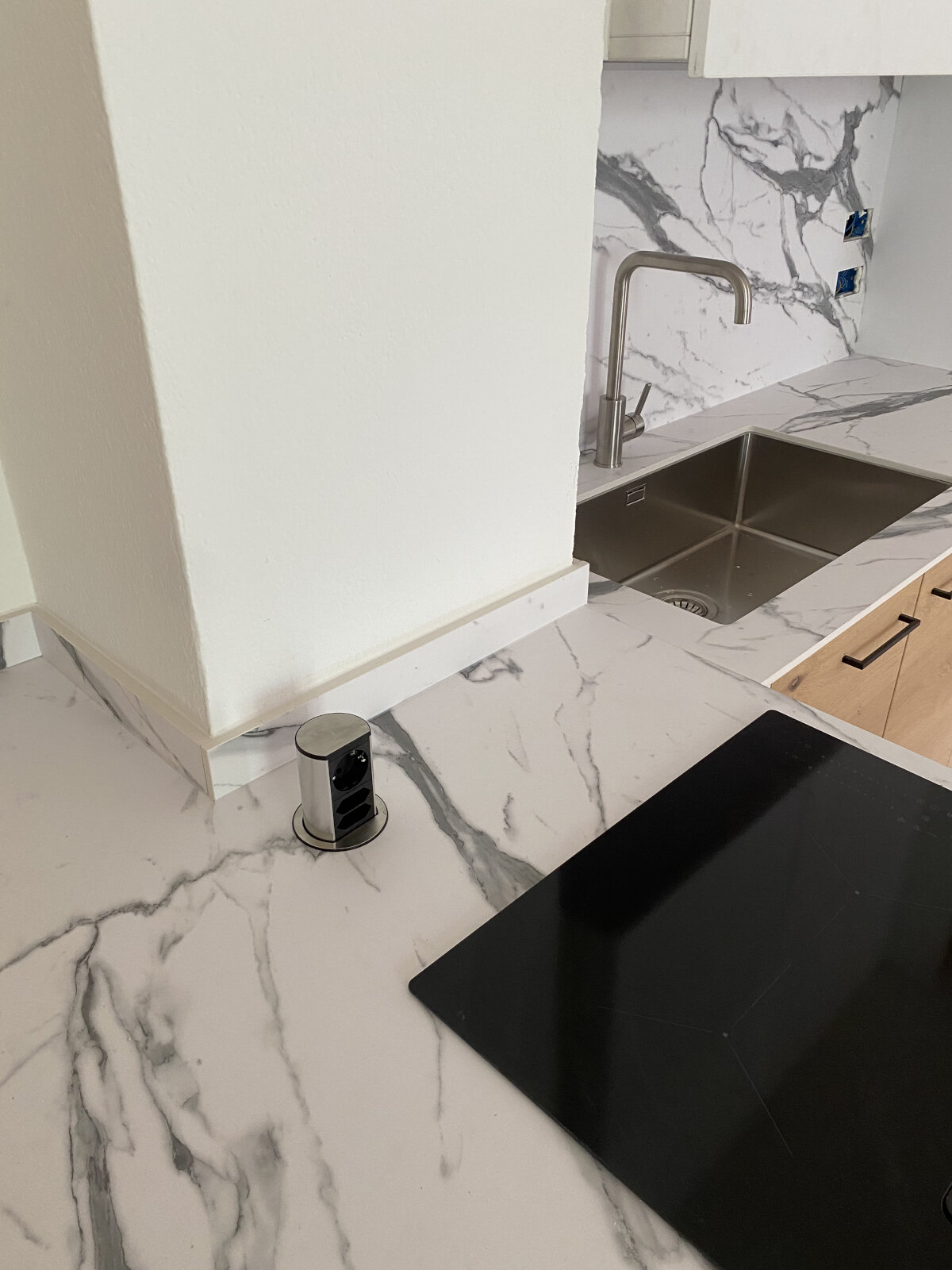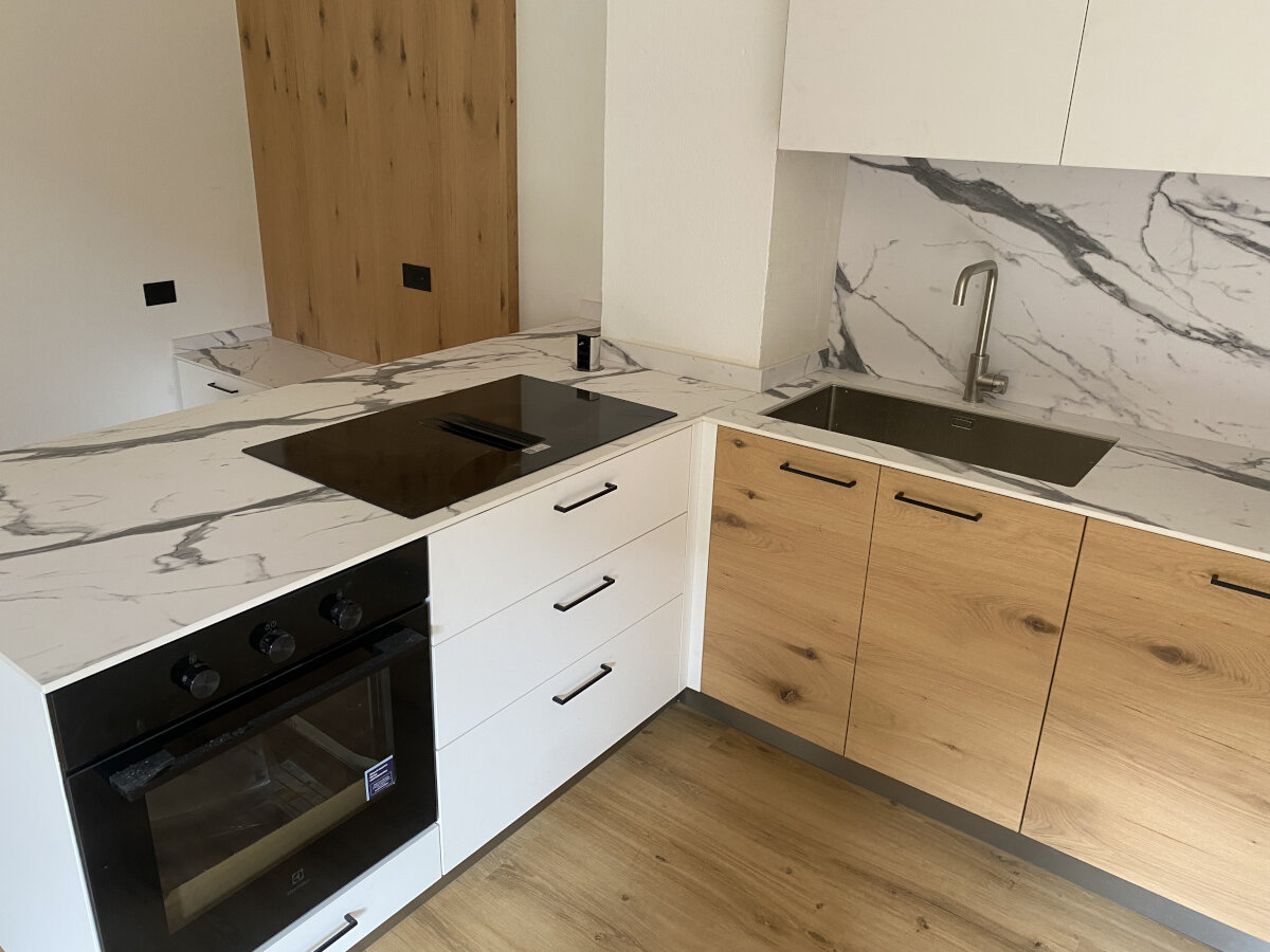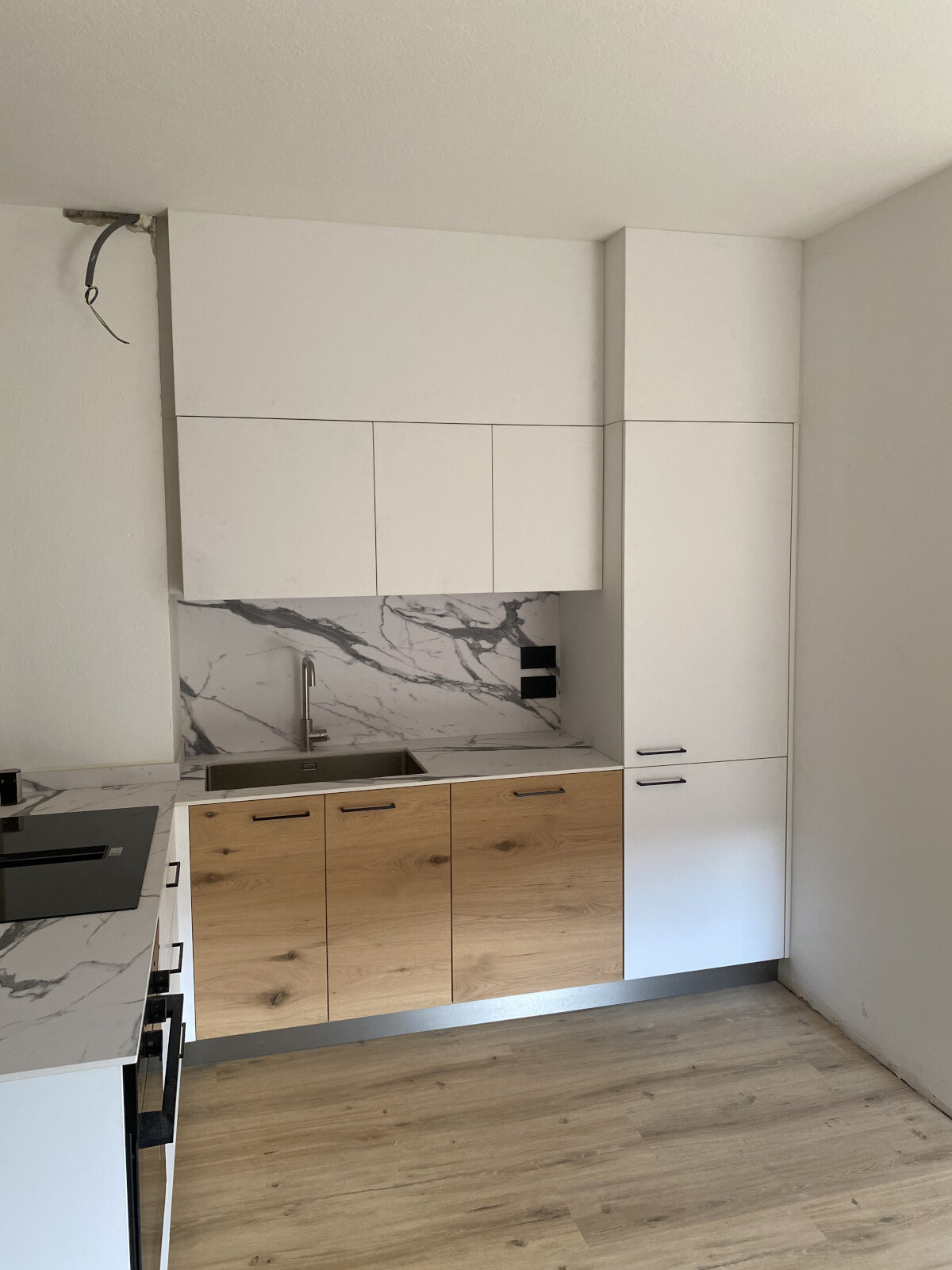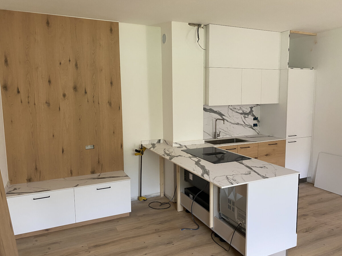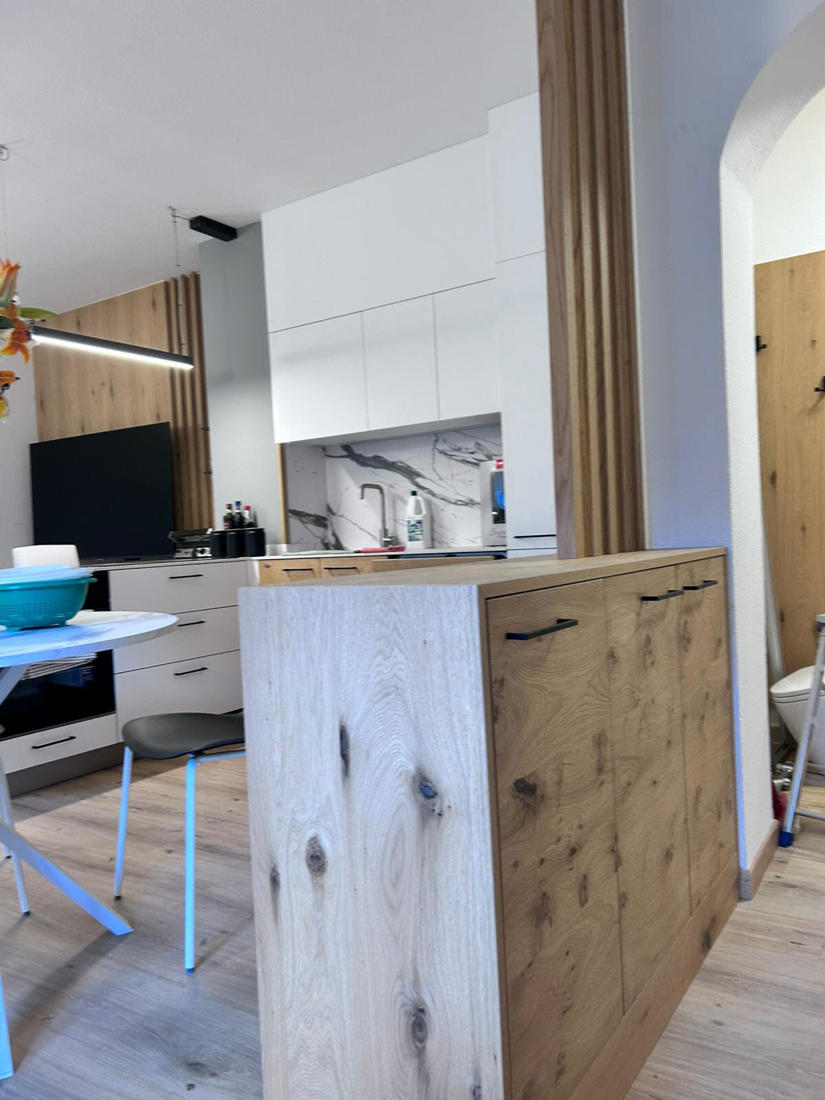 Cucina e arredi su misura con linee essenziali, colonne integrate e finiture calde che rendono l’ambiente ordinato e accogliente. I mobili su misura ottimizzano gli spazi e creano un’estetica continua, pulita e funzionale in tutta la zona giorno.