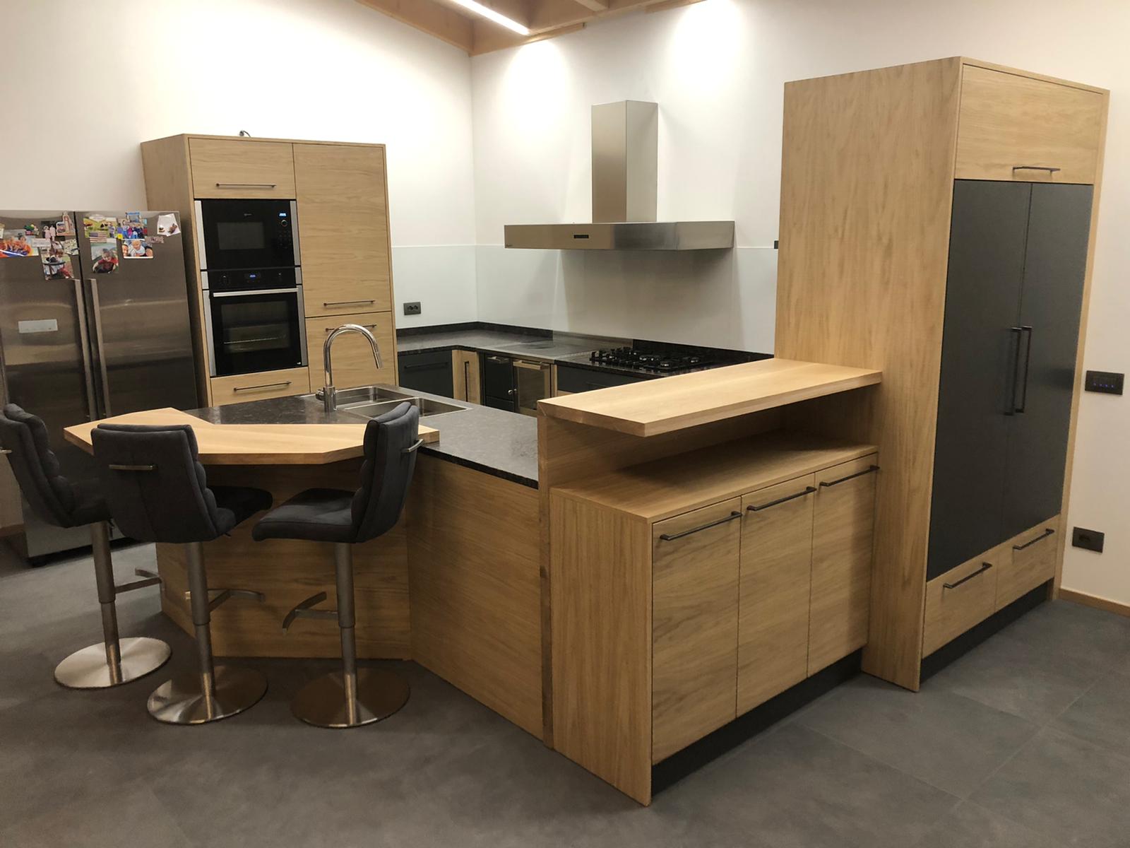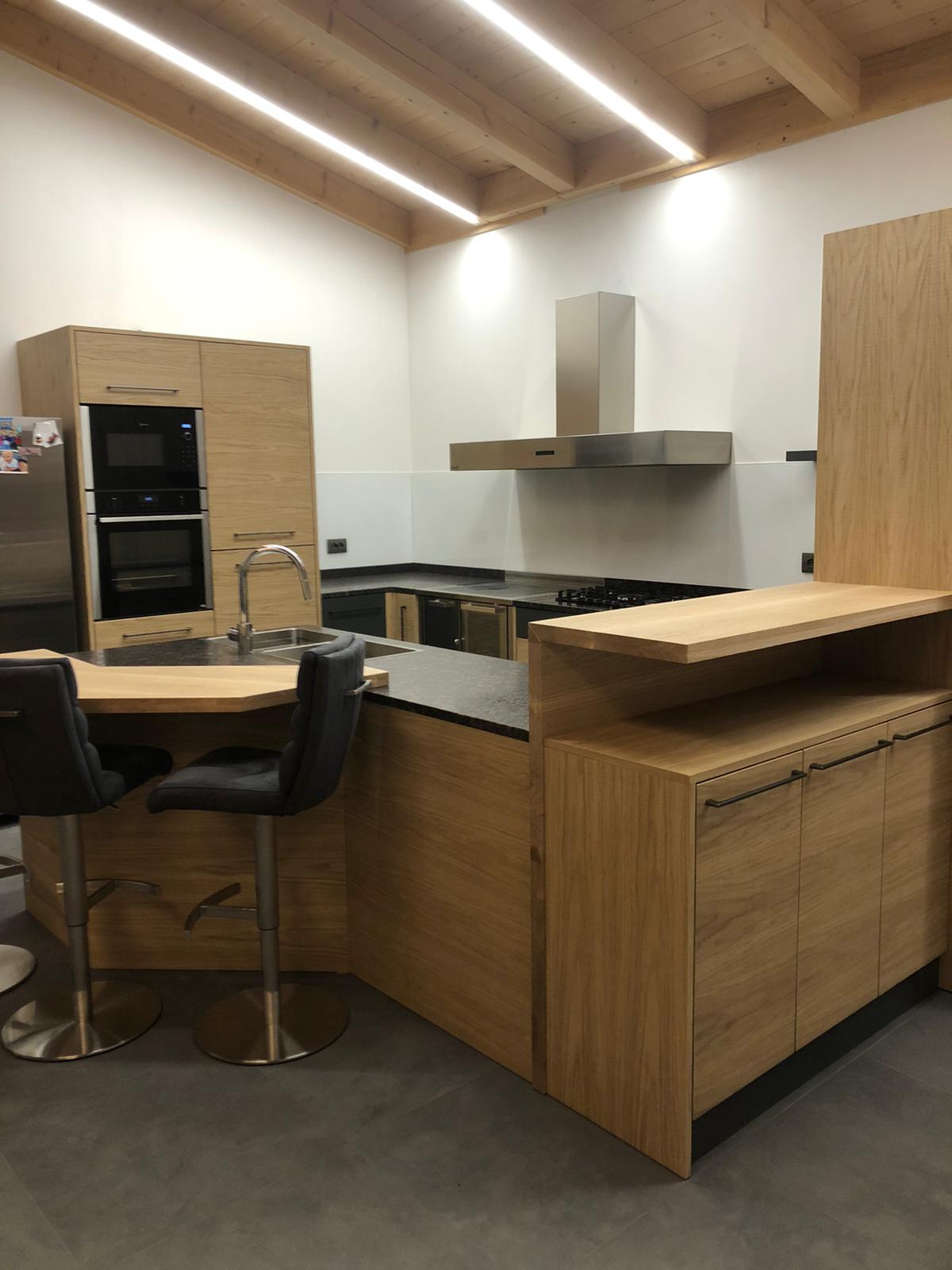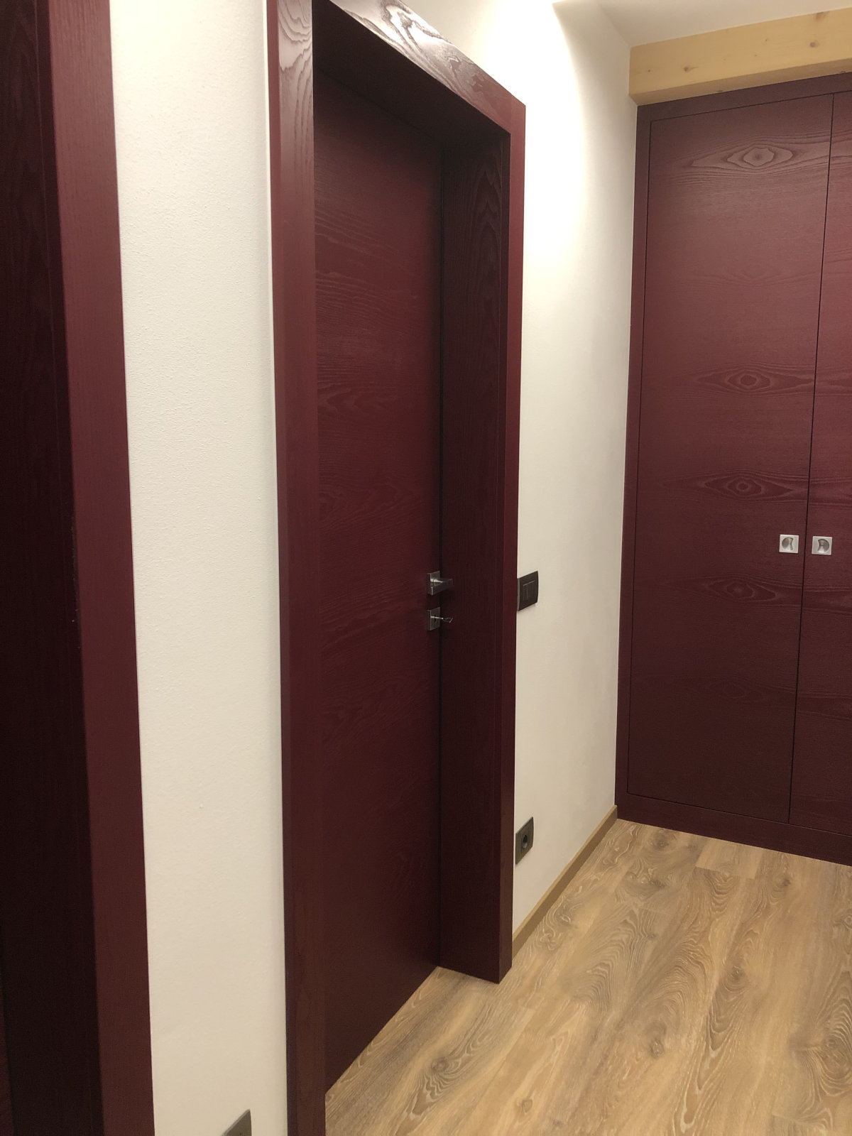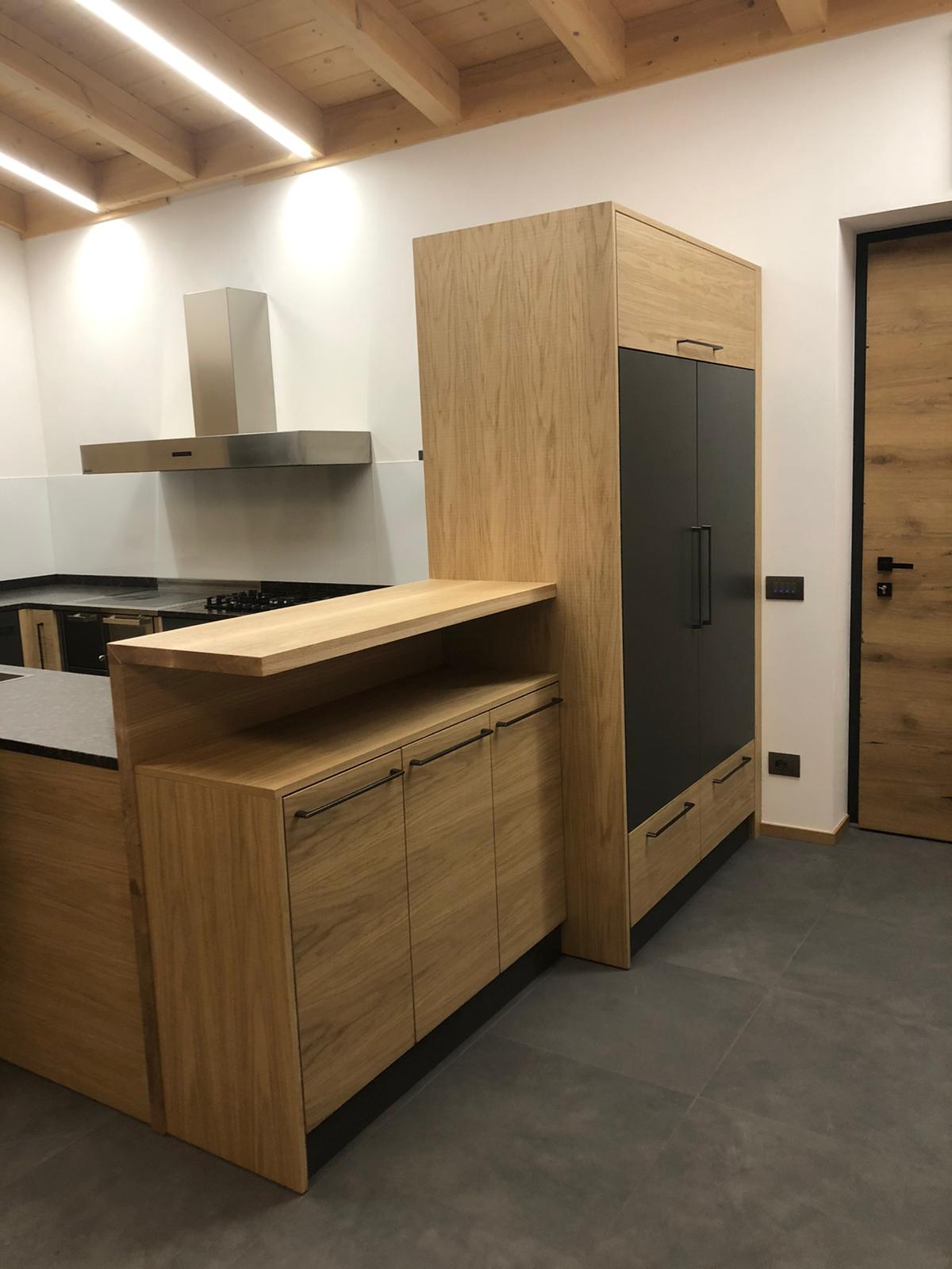 Cucina, finestre e porte interne su misura, progettate per dare continuità estetica all’abitazione. La cucina integra colonne funzionali, piani puliti e finiture calde, mentre serramenti e porte coordinate completano un ambiente ordinato, luminoso e armonico in tutti gli spazi.