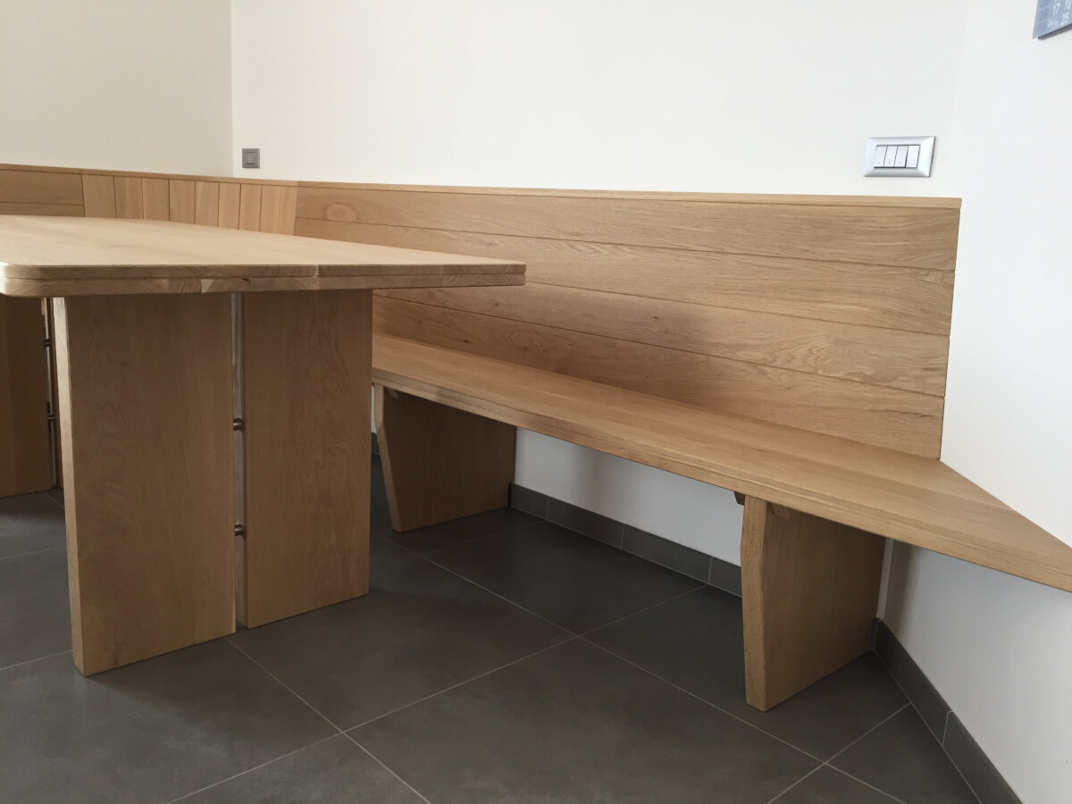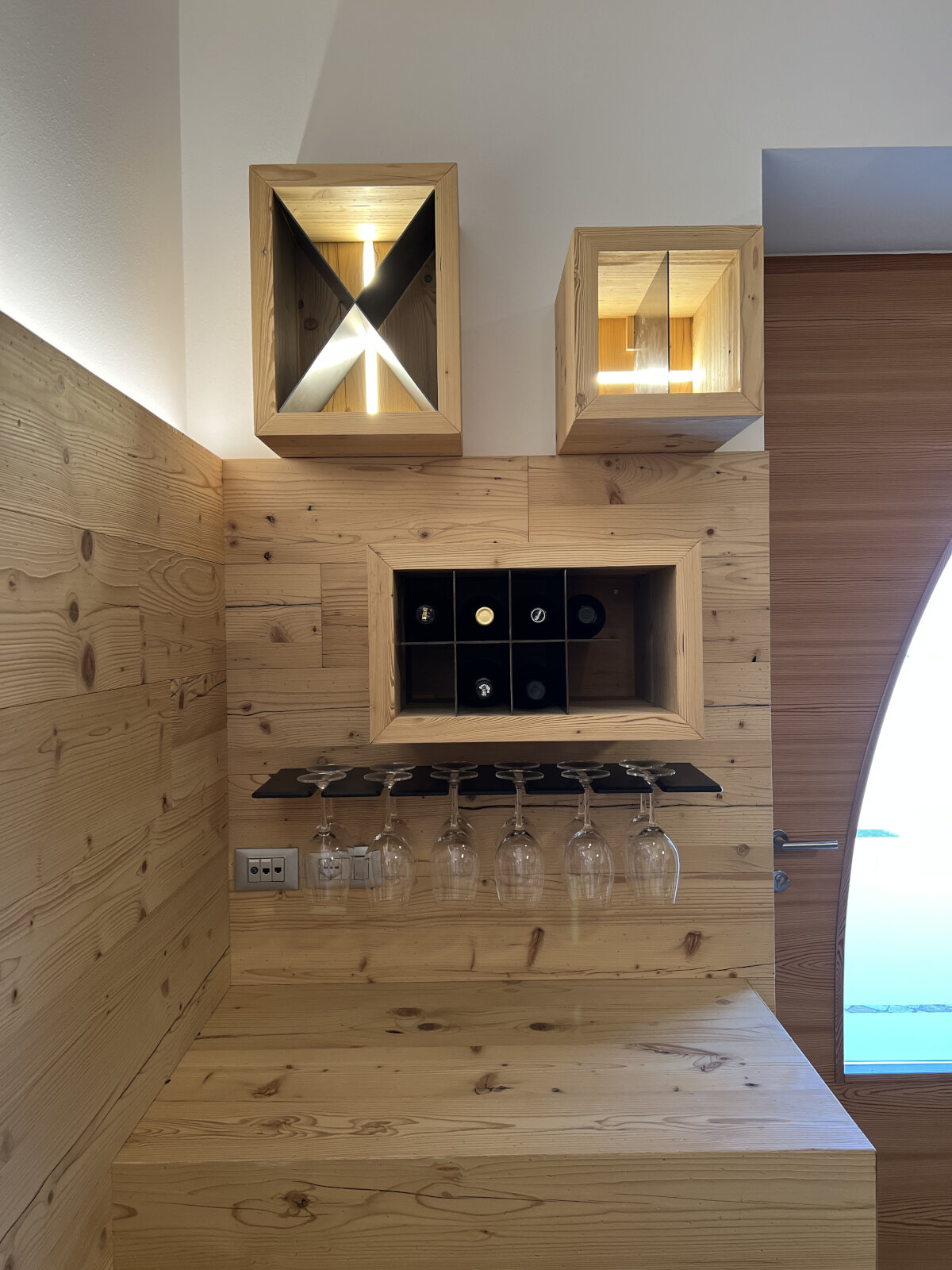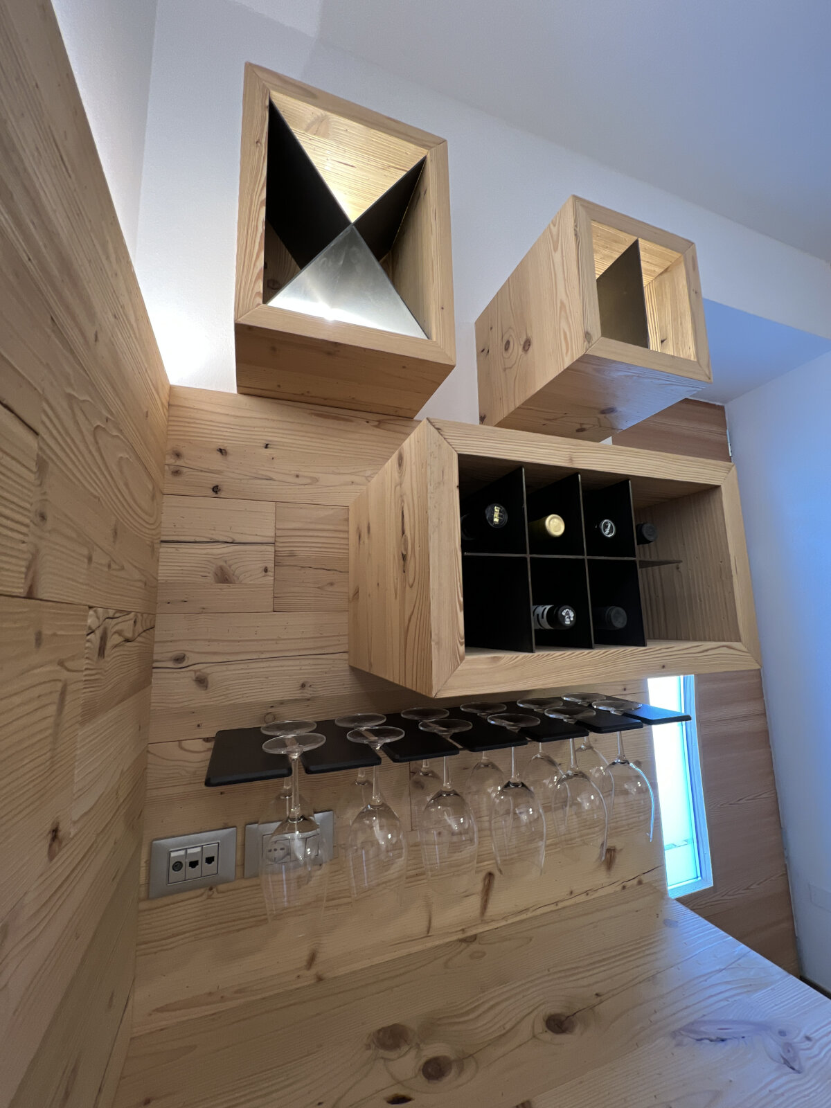 Taverna su misura con serramenti e arredi coordinati: portoncini e finestre in legno/alluminio, rivestimenti caldi e un tavolo artigianale che diventa il fulcro dello spazio. L’insieme crea un ambiente accogliente, ordinato e materico, ideale per momenti di convivialità.