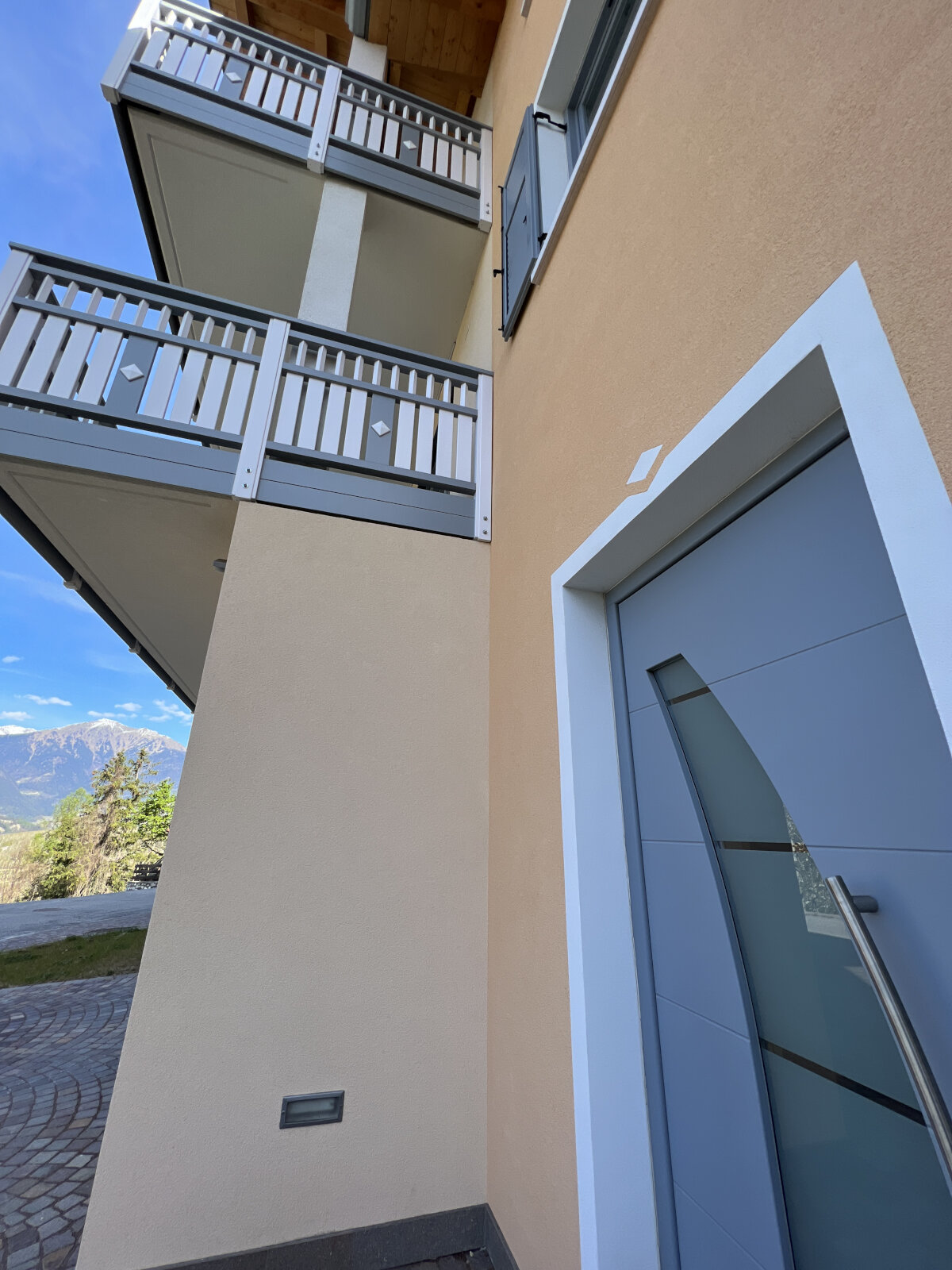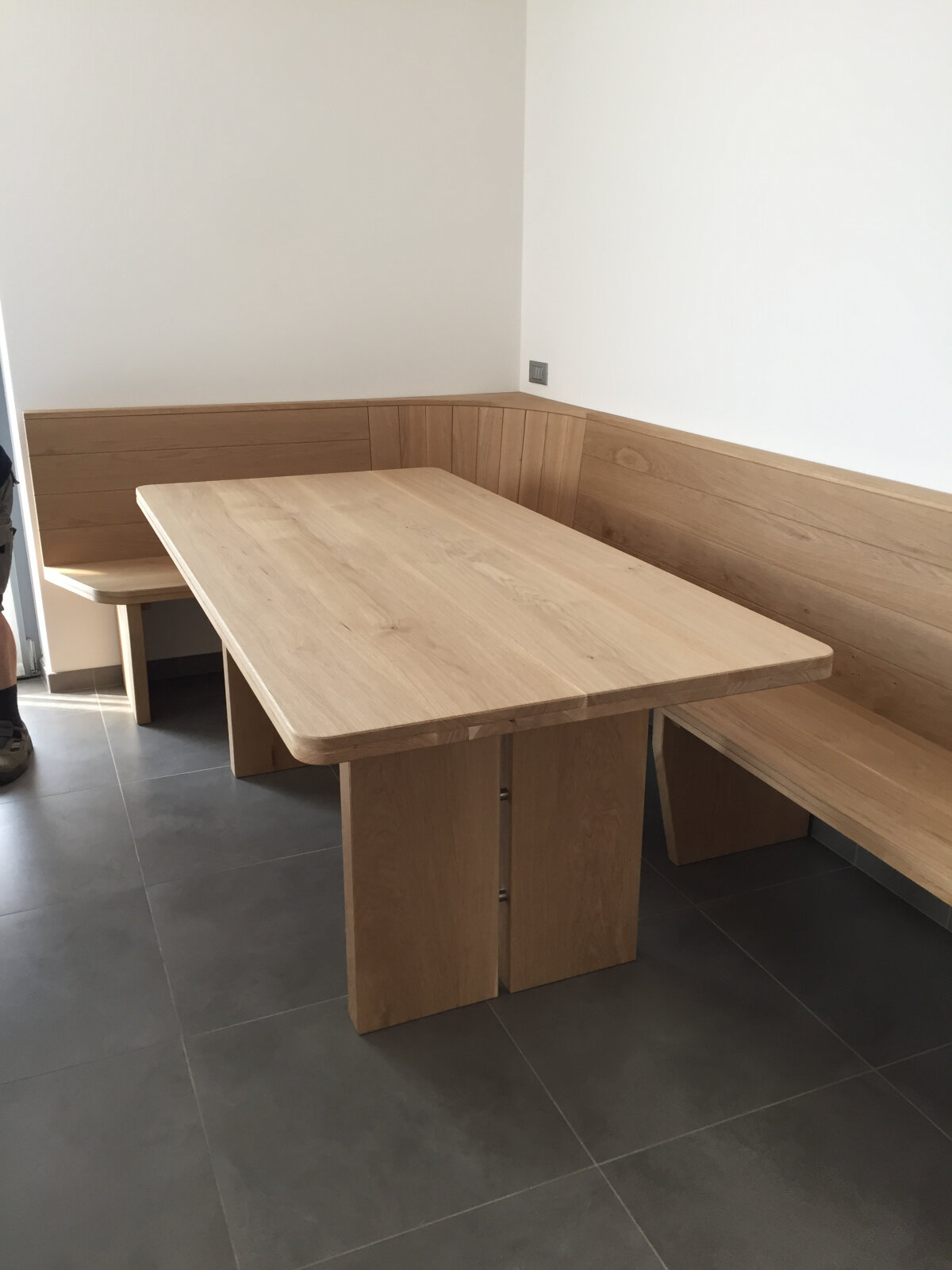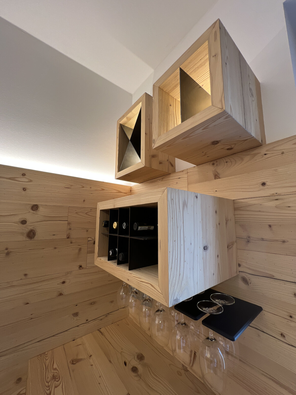 Taverna su misura con serramenti e arredi coordinati: portoncini e finestre in legno/alluminio, rivestimenti caldi e un tavolo artigianale che diventa il fulcro dello spazio. L’insieme crea un ambiente accogliente, ordinato e materico, ideale per momenti di convivialità.